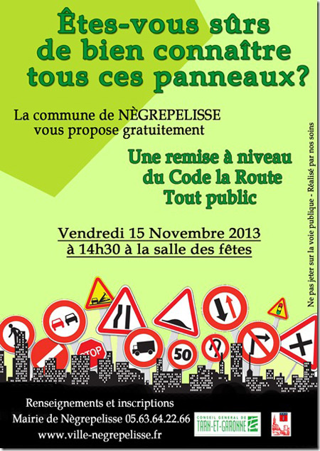 La commune de Nègrepelisse propose gratuitement une remise à niveau du code de la route le Vendredi 15 Novembre 2013 à 14h30 à la Salle des Fêtes.