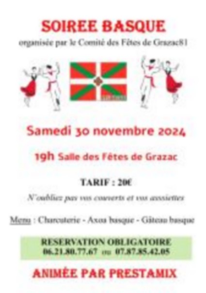 Samedi 30 novembre à 19h00, le Comité des Fêtes de Grazac vous invite à un repas dansant organisé dans une ambiance basque, pour seulement 20 euros et animé par le DJ PRESTAMIX (salle des fêtes de Grazac).