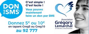 Si vous souhaitez soutenir la lutte contre la mucoviscidose dès maintenant, vous pouvez envoyer un SMS en tapant GREG5 ou GREG10 au 92 777 et vous ferez ainsi un don de 5€ ou 10€ à l’Association Grégory Lemarchal.