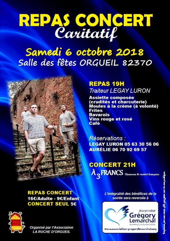L’association La Ruche d’Orgueil organise le samedi 6 octobre 2018 un repas concert caritatif dont l’intégralité des bénéfices sera reversée à l’Association Grégory Lemarchal, qui lutte contre la mucoviscidose.