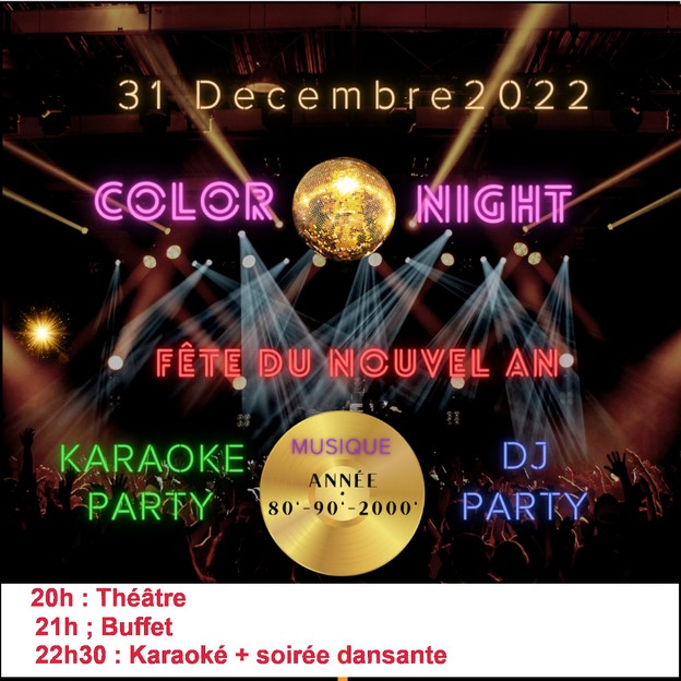 Au programme : Théâtre – Buffet – Concours de Karaoké (une bouteille de champagne à gagner) – Soirée dansante avec DJ (années 80, 90, 2000).