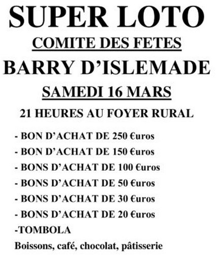 Samedi 16 mars à 21h, profitez du loto du Comité des fêtes de Barry d’Islemade !