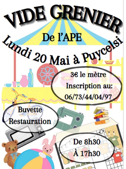 Après une petite pause d’un an ! La nouvelle équipe de l’APE de puycelsi a le plaisir de vous accueillir au sein du village de puycelsi le 20 mai 2024 pour son traditionnel vide grenier !