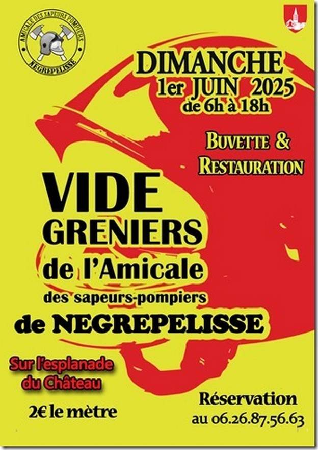 Vide greniers de l’Amicale des Sapeurs Pompiers.. de Nègrepelisse (82) Parlons-en !, A côté de chez nous, vide grenier, N°230 - Mai 2025 1 juin 2025 de 6h00 à 18h00 Planifié ical Google outlook Parlons-en ! A côté de chez nous vide grenier N°230 - Mai 2025 Nègrepelisse, Montauban, Tarn-et-Garonne, Occitanie, France métropolitaine, 82800, France Carte Dimanche 1er juin 2025, de 6h. à 18h., esplanade du Château. Information communiquée par Aurore DEFFRENE Retrouvez tous les événements dans l’agenda ! Partager : Cliquer pour envoyer un lien par e-mail à un ami(ouvre dans une nouvelle fenêtre) E-mail Cliquez pour partager sur Facebook(ouvre dans une nouvelle fenêtre) Facebook Cliquez pour partager sur WhatsApp(ouvre dans une nouvelle fenêtre) WhatsApp J’aime ça :J’aime chargement… Similaire Nègrepelissevide grenierspompierS2225