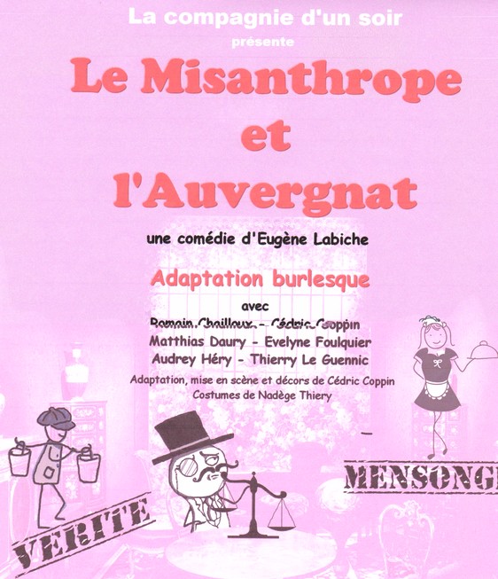 C’est à l’Atelier81, salle du Pigné, 6, rue père Bonsirven, à Lavaur que se produira la troupe « La compagnie d’un soir » qui vient de Milly la forêt pas très loin de Paris, troupe composée d’enseignants en vacances qui vont nous jouer » Le Misanthrope et l’ Auvergnat » une comédie burlesque d’ Eugène Labiche adaptée et mise en scène par Cédric Coppin