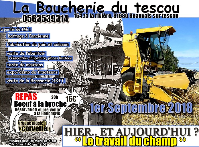 Le samedi 1er Septembre 2018, à partir de 14h., Zone artisanale de la rivière.La Boucherie du Tescou et l’Abattoir de découpes des Tuileries organisent une fête!