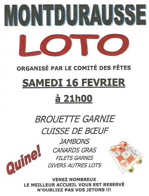 Le comité des fêtes de Montdurausse organise son traditionnel loto le samedi 16 Février 2013 à partir de 21h à la salle des fêtes du village.