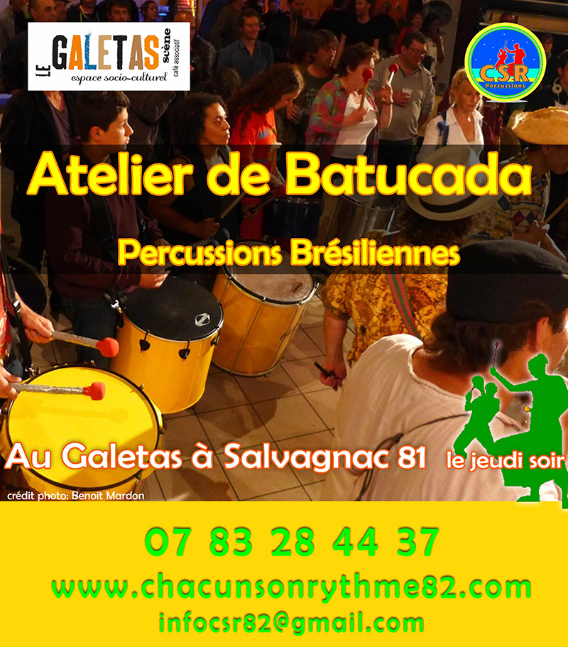 Le Galetas et l’association Chacun Son Rythme proposent une formation de percussions Brésiliennes offrant une excellente connaissance des rythmes de la Batucada brésilienne tel que le Samba, Samba-Reggae, Samba Funk, Afro Samba, Ijexa et bien d’autres rythmes Afro-Brésiliens . Garantie 100% Brésil.