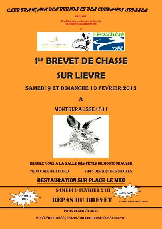Samedi 9 et dimanche 10 février 2013, le Club Français du Bruno du Jura et des Chiens Courants Suisses en collaboration avec la Société de chasse de Saint-Urcisse – Montdurausse organise le 1er brevet de chasse sur lièvre non tiré sans mise à mort. Cette manifestation ouverte au public, est placé sous l’égide de la Société Centrale Canine, la Fédération Départementale des chasseurs du Tarn, la Direction Départementale de la Cohésion Sociale et de la Protection des Populations du Tarn et de la Direction Départementale des Territoires du Tarn.