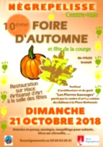La Foire d‘Automne et fête de la courge, organisées par la Mairie de Nègrepelisse, conjointement aux animations du centre d’Art La cuisine, se déroulera Dimanche 21 octobre le temps d’une journée ponctuée par la vente de nombreux produits alimentaires locaux et vestimentaires, un marché artisanal, des ateliers pour enfant (maquillage, dessin sur citrouille, balade en calèche), des petits concerts et des manèges. L’objectif est de réunir autour du thème de l’automne et de la citrouille, légume de saison par excellence à l’approche d’Halloween, les savoir-faire artisanaux (bijoux, peinture sur porcelaine, crochet, poterie, travail sur bois, tableaux …) gastronomiques, le tout sous la forme d’une belle foire. Renouer avec l’esprit la foire traditionnelle pendant lesquels le goût et la fête sont à l’honneur sont les maîtres-mots.