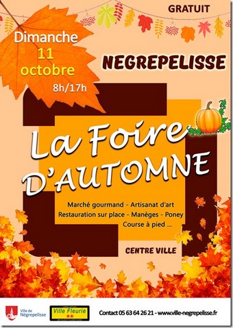 Pour la 12ème année consécutive, la Foire d’Automne et fête de la courge, organisées par la Mairie de Nègrepelisse, conjointement à la course d’endurance pédestre La Nègrepelissienne, se dérouleront Dimanche 11 octobre le temps d’une journée ponctuée par la vente de nombreux produits alimentaires et vestimentaires, un marché artisanal, des balades en calèche et en poney, des manèges, animations en tout genre.