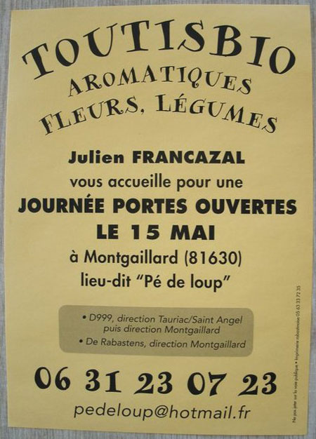 Julien Francazal vous accueille pour une journée portes ouvertes le Dimanche 15 Mai 2011. Vous pourrez y découvrir les plantes aromatiques, légumes et fleurs qu’il cultive à Montgaillard.