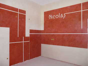 Une ambiance dynamique et chaleureuse impulsée par les couleurs choisies par Séline Monteillet, spécialisée dans les enduits décoratifs. Des boites de gâteaux géantes représentées dans un style épuré rappelleront aux plus distraits  la spécialité de la maison … la Pâtisserie !!!