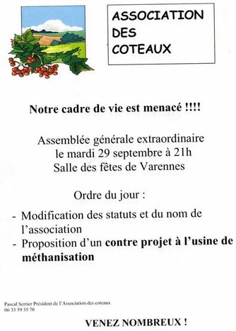 Les habitants voisins du projet de la « Zone d’Activités » sur laquelle pourrait être implanté une unité de méthanisation se sont réunis mi septembre à l’initiative de l’association Coteaux et vallée du Tescou. Le nombre de participants à cette réunion publique d’information ayant mis à jour l’émoi des habitants de la zone, la Communauté des Communes du Quercy Vert a distribué un « document de présentation » espérant ainsi « apaiser les inquiétudes ». Ce document, très général, annonce toutefois un élément important : pas de boues de stations d’épuration ni de déchets ménagers ! Des éléments plus précis devraient être fournis par les porteurs du projet qui rencontrent ce lundi 28 septembre les représentants du collectif des habitants. Tout ceux qui veulent en savoir plus sont donc invités à l’ assemblée générale extraordinaire de l’association des coteaux le mardi 29 septembre à 21 à Varennes.