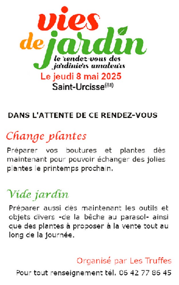 Préparez les « Vies de Jardin »…à Saint Urcisse (81) Agriculture, Parlons-en !, Vie Pratique, Saint-Urcisse 8 mai 2025 de 9h00 à 13h00 Planifié ical Google outlook Agriculture Parlons-en ! Vie Pratique Saint-Urcisse Saint-Urcisse 81630 Carte Jeudi 8 mai 2025… Information communiquée par « Les Truffes » Partager : Cliquer pour envoyer un lien par e-mail à un ami(ouvre dans une nouvelle fenêtre) E-mail Cliquez pour partager sur Facebook(ouvre dans une nouvelle fenêtre) Facebook Cliquez pour partager sur WhatsApp(ouvre dans une nouvelle fenêtre) WhatsApp J’aime ça :J’aime chargement… Similaire S1925Saint Urcissevies de jardin