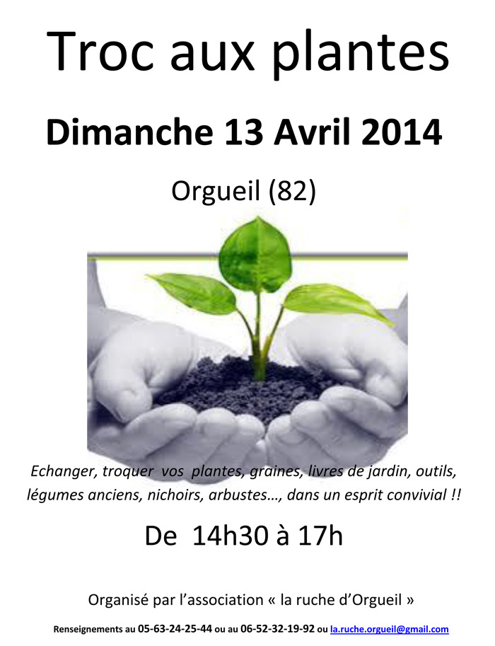 La Ruche d’Orgueil organise un troc aux plantes le dimanche 13 Avril 2014 de 14h 30 à 17h à l’Ecole maternelle la Nauzette à Orgueil. Couvert en cas de pluie.
