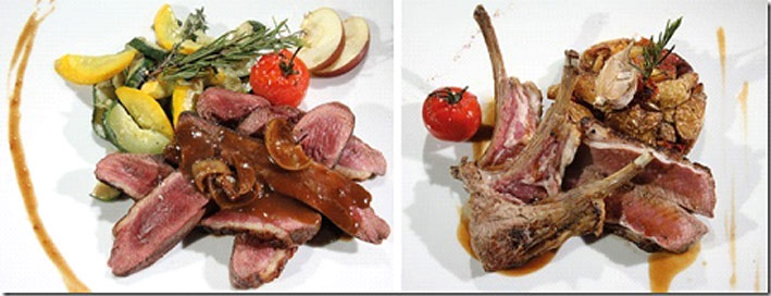 Puis arrivent des viandes tendres et succulentes : Le magret de canard avec une sauce aux deux pommes (au cidre et vinaigre de cidre), pommes caramélisées au beurre salé. L’agneau du Quercy grillé à l’ail violet et au romarin accompagné de pommes « Cardinales » (pommes de terre grenailles sautées avec une réduction d’oignon rouge et de tomates confites dans du vin rouge du Quercy) et de courgettes vertes et jaunes et d’aubergines roses.