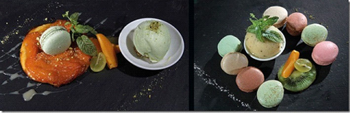 Et enfin des desserts, tels des caresses qui ravissent le palais : Une tarte tatin à l’abricot au caramel de beurre salé et éclats de pistache, macarons et glace pistache. La farandole de macarons faits maison (pomme cannelle, menthe chocolat, rose, cerise amarena, fleur d’oranger) et sorbet passion ananas.