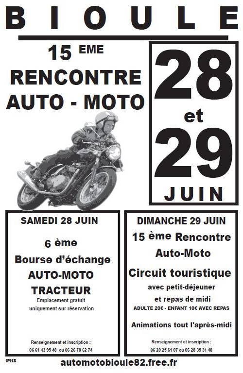 L’association «La rencontre Auto Moto Bioule» organise cette année les 15ème Rencontre Auto Moto et 6ème Bourse d’échange les 28 et 29 Juin 2014.