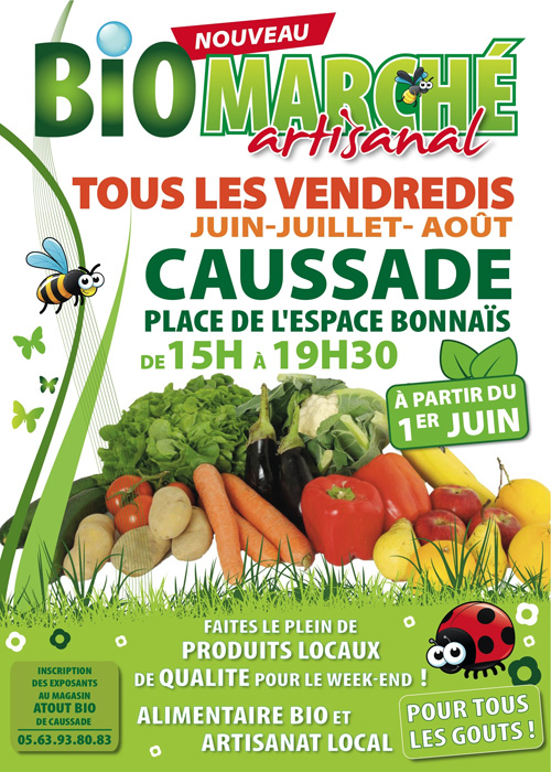 La décision de créer un marché bio et artisanal à Caussade a été prise ! Tous les vendredis après-midi à partir du 1er juin 2012 pendant 3 mois (minimum), à inscrire sur votre agenda.