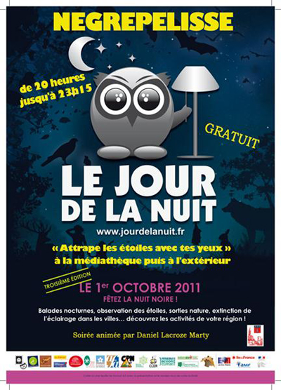 Samedi 1er Octobre 2011, « Le jour de la Nuit » va être célébré de manière massive grâce à plus de 300 manifestations partout en France. Plus de 150 villes et villages témoigneront de leur volonté de protéger la nuit noire et d’économiser l’énergie en éteignant une partie ou l’intégralité de leur éclairage public pour quelques heures !