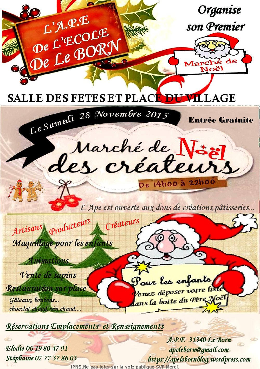 L’Association des parents d’élèves de Le Born organise son premier marché de noël, le Samedi 28 Novembre 2015 de 14h à 22 h à la salle des fêtes du village.