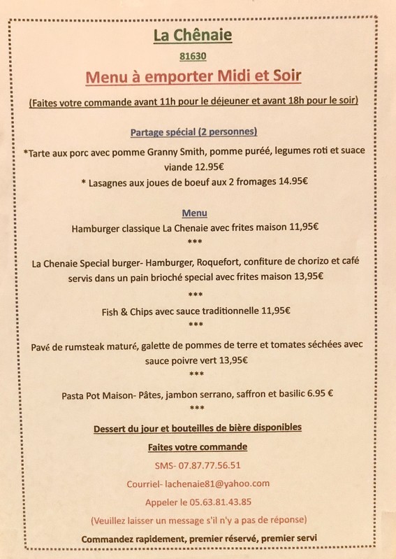 Les restaurants ne peuvent toujours pas ouvrir, mais nous proposons un service de plats à emporter midi et soir.