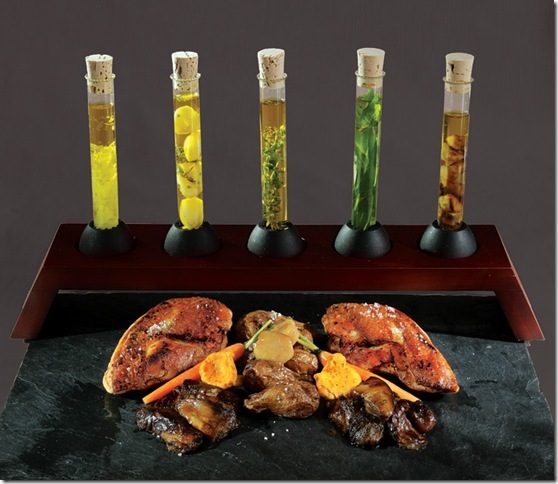 ou encore ce savoureux poulet rôti accompagné de cèpes, girolles, pommes de terre rattes et servi avec cinq huiles (olive extra vierge) aromatisées : citron vert, ail confit, thym citronné, basilic ou pieds de cèpes.