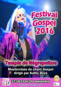 Avec le mois de septembre, arrivent la rentrée et le 13° festival gospel de Nègrepelisse. Organisé par l’association Musiques au Temple en bas Quercy, le festival se déroulera au temple de Nègrepelisse les 17,18, 23, 24 et 25 Septembre 2016.