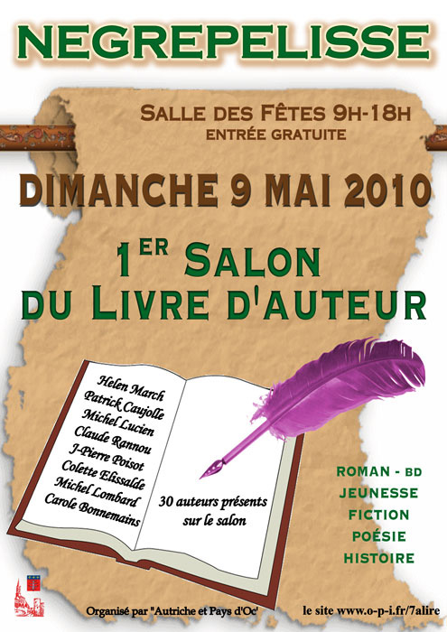 L’association Autriche et Pays d’Oc, organise le 1er Salon du Livre d’Auteurs à Nègrepelisse le Dimanche 9 Mai 2010, de 9h à 18h.