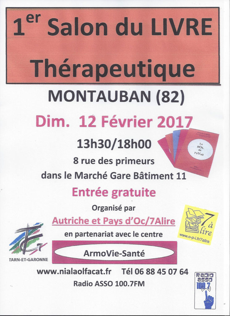 Pour la première fois, l’Association Autriche et Pays d’Oc / 7alire, en partenariat avec le centre ArmoVie-Santé seront présents à Montauban pour le « 1er Salon du livre Thérapeutique-Auteurs » le Dimanche 12 Février 2016, de 13h30 à 18h, dans le marché gare.
