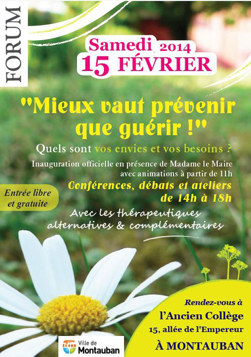 Une journée d’information sur les thérapeutiques alternatives et complémentaires aura lieu sur Montauban à l’Ancien Collège le Samedi 15 février 2014.