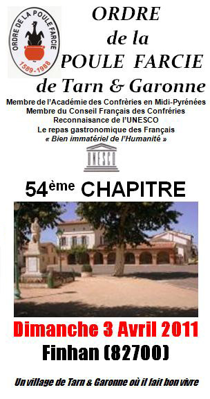 - 12h45 – Intronisations (salle des fêtes) dans l’Ordre de la Poule Farcie de Tarn & Garonne