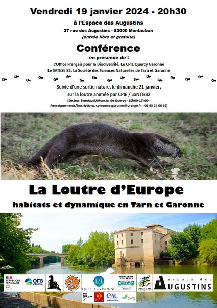 - Vendredi 19 janvier 2024 : en entrée libre et gratuite à l’Espace des Augustins (27 rue des Augustins) à Montauban à 20h30, une soirée conférence/débat « La Loutre d’Europe : habitats et dynamique en Tarn et Garonne » animée par la Gilles Béchard (SSNTG), L’OFB 82 et Philippe Mannella (CPIE Quercy Garonne)