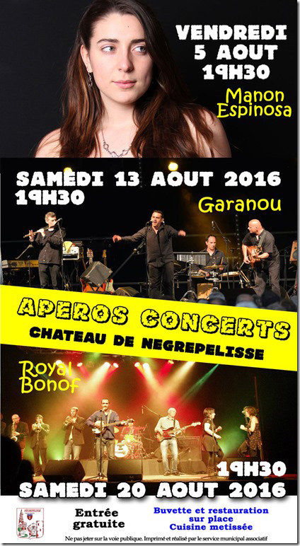Apéros concerts au château … à Nègrepelisse (82) A côté de chez nous, Culture, Vive l'été !, Loisirs, N° 125 - Août 2016 La Municipalité de Nègrepelisse propose 3 concerts les Vendredi 5, Samedis 13 et 20 Août 2016. Trois apéros concerts au château … à Nègrepelisse (82) Tarifs : Gratuit Buvette et restauration sur place. Cuisine métissée. Communiqué par Aurore DEFFRENE Partager : Cliquer pour envoyer un lien par e-mail à un ami(ouvre dans une nouvelle fenêtre) E-mail Cliquez pour partager sur Facebook(ouvre dans une nouvelle fenêtre) Facebook Cliquez pour partager sur WhatsApp(ouvre dans une nouvelle fenêtre) WhatsApp J’aime ça :J’aime chargement… Similaire NègrepelisseApéro concertConcerts