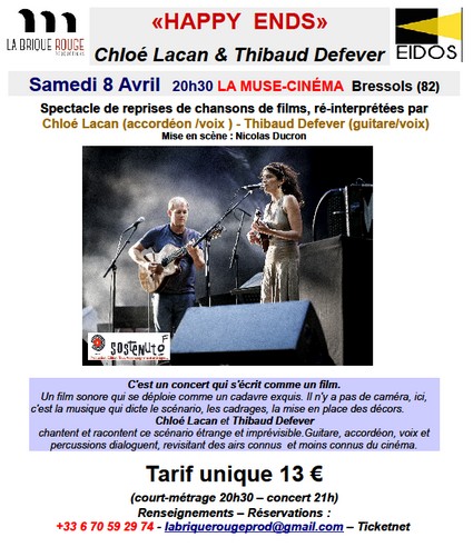 Happy Ends, c’est un spectacle de reprises de chansons de films, réinterprétées par Thibaud Defever et Chloé Lacan. C’est un concert théâtralisé qui s’écrit comme un film. Chansons, thèmes, mélodies, dialogues de films se succèdent, tous sortis de leurs contextes d’origine, et viennent raconter, le temps d’un spectacle, une nouvelle histoire. Chloé Lacan et Thibaud Defever chantent et racontent ce scénario étrange et imprévisible. Guitare, accordéon, voix et percussions dialoguent, tout en finesse, revisitant des airs connus et moins connus du cinéma. Du Mépris de Godard au Cabaret de Bob Fosse en passant par Orphéo Negro, Cria Cuervos ou Hôtel du Nord, ces deux amoureux des salles obscures prennent plaisir à mélanger les styles, les langues, les souvenirs et déroulent à nos oreilles leur bande originale idéale.