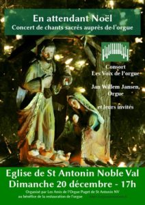 Le Consort-Les voix de l’orgue est fier de vous annoncer un petit concert de Noël, tout simple, le dimanche 20 décembre, à 17h, à l’église de St Antonin Noble Val.Petit parce que l’église ne sera pas chaude, donc nous resterons raisonnables sur la durée du moment musical.
