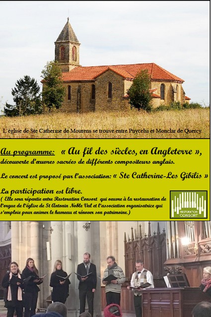L’ensemble vocal « Restoration Consort » de St Antonin Noble Val, dirigé par Geoffrey Cryer, a été invité et donnera un concert intitulé : « Au fil des siècles, en Angleterre ». Ce programme permet la découverte d’œuvres sacrées de différents compositeurs anglais : Purcell, Byrd, Dering, Stanford, Weelkes, …