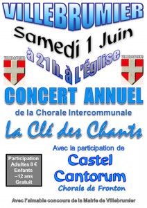La Chorale intercommunale de Villebrumier, La Clé des Chants donnera son traditionnel concert de Printemps le samedi 1er Juin 2013 en l’église du village à 21 h.