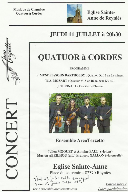 Jeudi 11 juillet 2013, à 20h.30, en l’église Sainte Anne de Reynies, concert donné par le quatuor à cordes « Arco Terzetto »