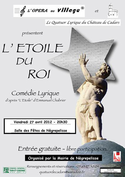 Après les succès de Montauban et Albias, l’exhilarante tournée L’ETOILE DU ROI se poursuit à Nègrepelisse (cette fois sans neige!!) vendredi 27 avril 2012 à 20h30 à la Salle des Fêtes ; ce spectacle, organisé par la Mairie, sera à entrée gratuite.