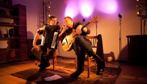 Un accordéon et une guitare n’appellent pas obligatoirement des flonflons et un bal. Ces deux atypiques, à la tension au moins égale à leur douceur, produisent une musique d’étals de marché, de randonnées pédestres, de pêche à la ligne… qui nous fait voyager dans une proximité évidente mais peut aussi, d’une cavalcade sur le manche ou d’un galop sur le clavier, nous téléporter à l’autre bout de l’empire européen de l’imaginaire ou même dans la campagne américaine. Cette musique s’entend où on l’attend pas !