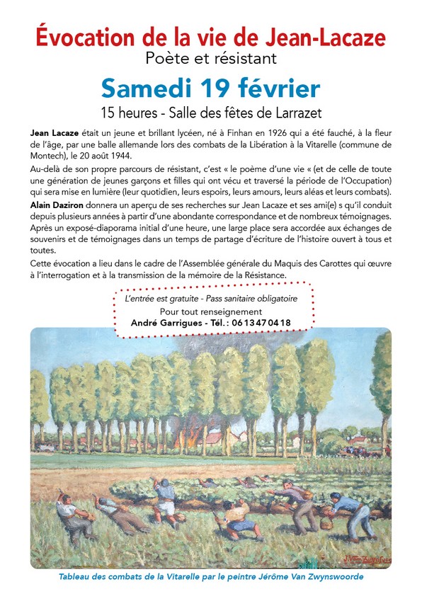 Jean Lacaze, jeune poète et résistant de Finhan ( 82) – tué à 18 ans par une balle allemande en 1944 à Montech lors des combats de la Libération –