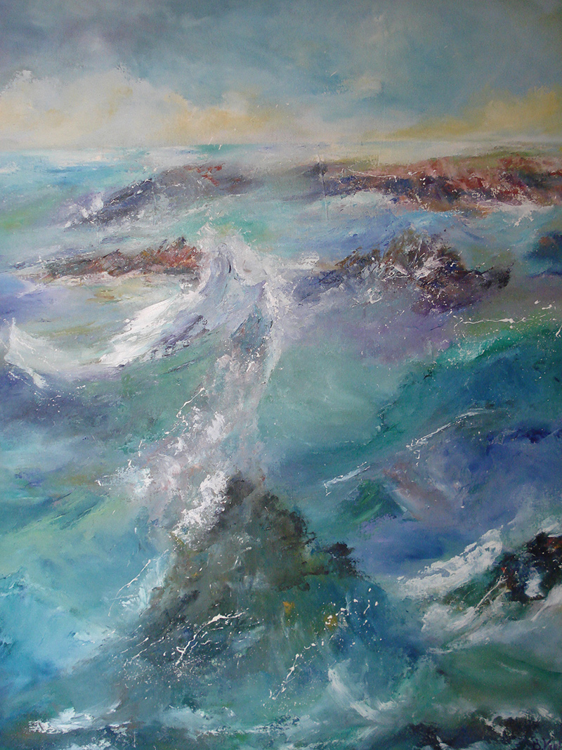 Elle cherche la forme avec la couleur, et peint avidement la nature qui l’entoure ; son vécu en Bretagne entrainant parfois sur une même toile l’amalgame d’un paysage de cette région avec un paysage de Provence et vice versa !