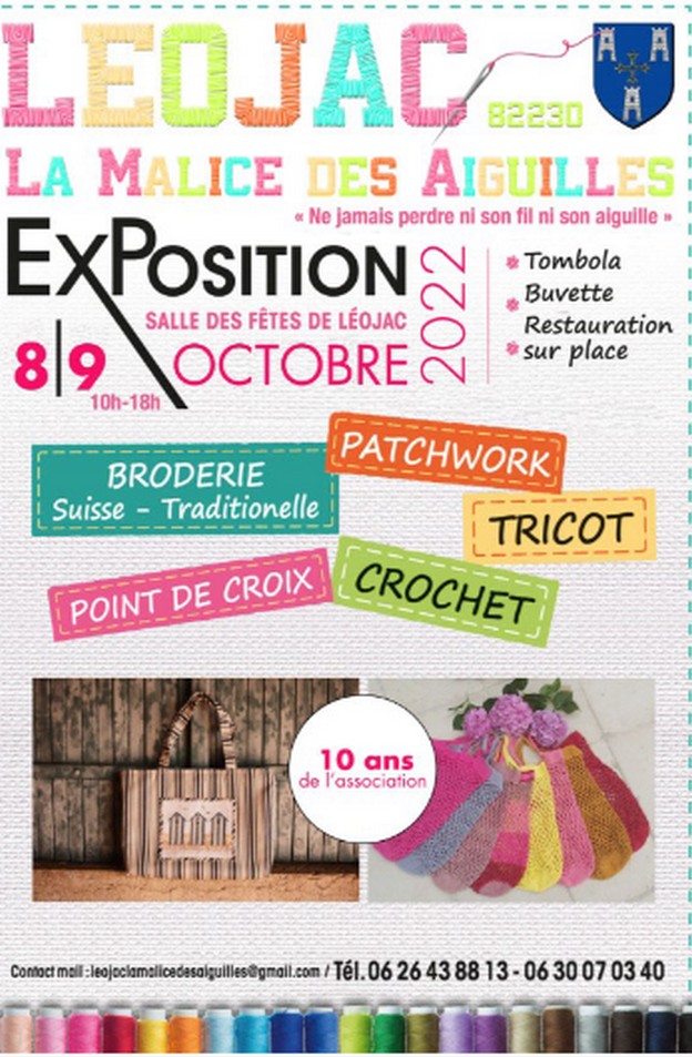 Samedi 8 et dimanche 9 octobre, de 10h.à 18h. à la salle des fêtes.Les 8 et 9 octobre 2022, nous organisons l’exposition de notre association Léojac La Malice des Aiguilles et nous fêtons nos 10 ans du club.