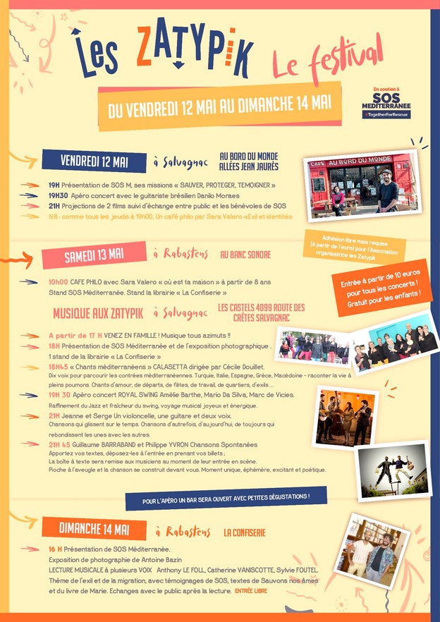 L’association « Les Zatypik » organise conjointement avec SOS MEDITERRANEE 3 jours de soutien ( lectures, conférences, débats, livres, projections, concerts) sur plusieurs sites de RABASTENS et SALVAGNAC ( voir affiche programme )