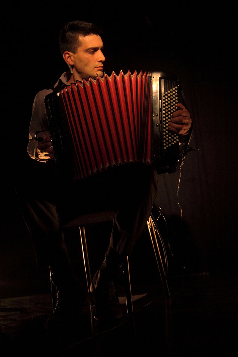« Une envie de développer un solo d’accordéon aux sonorités enjouées, créatives et généreuses. Avec ses compositions mais pas seulement, entre musique de cirque, jazz, rythmes des Balkans, restes de musette. »