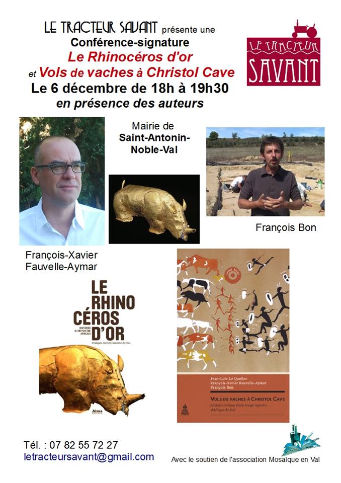 Le Samedi 6 décembre 2014 la librairie Le Tracteur Savant, avec le soutien de l’association Mosaïque en Val, propose une conférence-signature autour de deux livres brillants sur l’histoire et l’archéologie africaine : Le Rhinocéros d’or (dont la version poche est juste sortie) et Vols de vaches à Christol Cave, en présence des auteurs François-Xavier Fauvelle Aymar et François Bon.
