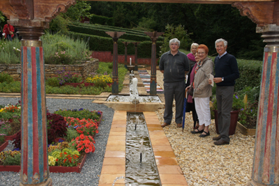 Ainsi valorisées par Dame Nature, les plantes semblaient interpeller les visiteurs qui se pressaient dans les allées pour atteindre « La nouveauté » qui les attendait au bas de la pente, à l’orée du bois où la nature sauvage côtoie l’art du jardin. Au terme de cette superbe balade fleurie et odorante, chaque hôte, dont M.G arrigues, président de l’Agence départementale de Développement touristique, était accueilli par Jean Donies dont l’idée de ce jardin indien/oriental a germé en Inde en 2009, lors de l’acquisition de huit colonnes anciennes et d’un dôme en teck fait sur mesures. Les canaux et bassins déjà existants ont été prolongés et de nouvelles structures installées. Peint dans des tons roses et bleus et décoré de motifs provenant d’Inde, un petit abri (avec banc comme en de nombreux autres points des jardins) permet de jouir de la vue la plus intéressante sur le nouvel espace, d’inspiration indienne surtout par son dessin librement inspiré des jardins moghols que l’on peut voir dans le Rajasthan, en privilégiant les jeux d’eau. Contenant les plantes annuelles aux couleurs vives et disposés selon les motifs d’un tapis, les «boites» rouges répondent à la contrainte physique du terrain rocheux sur toute la partie couverte de graviers gris. Les petits carrés de matériaux aux couleurs et textures différentes sont la libre traduction contemporaine de l’omniprésence de couleurs vives dans ce pays .