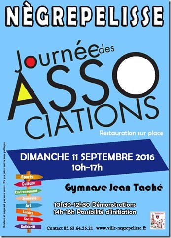 Le Dimanche 11 Septembre 2016 se déroulera la Journée des Associations au gymnase Jean Taché de Nègrepelisse de 10h à 17h.